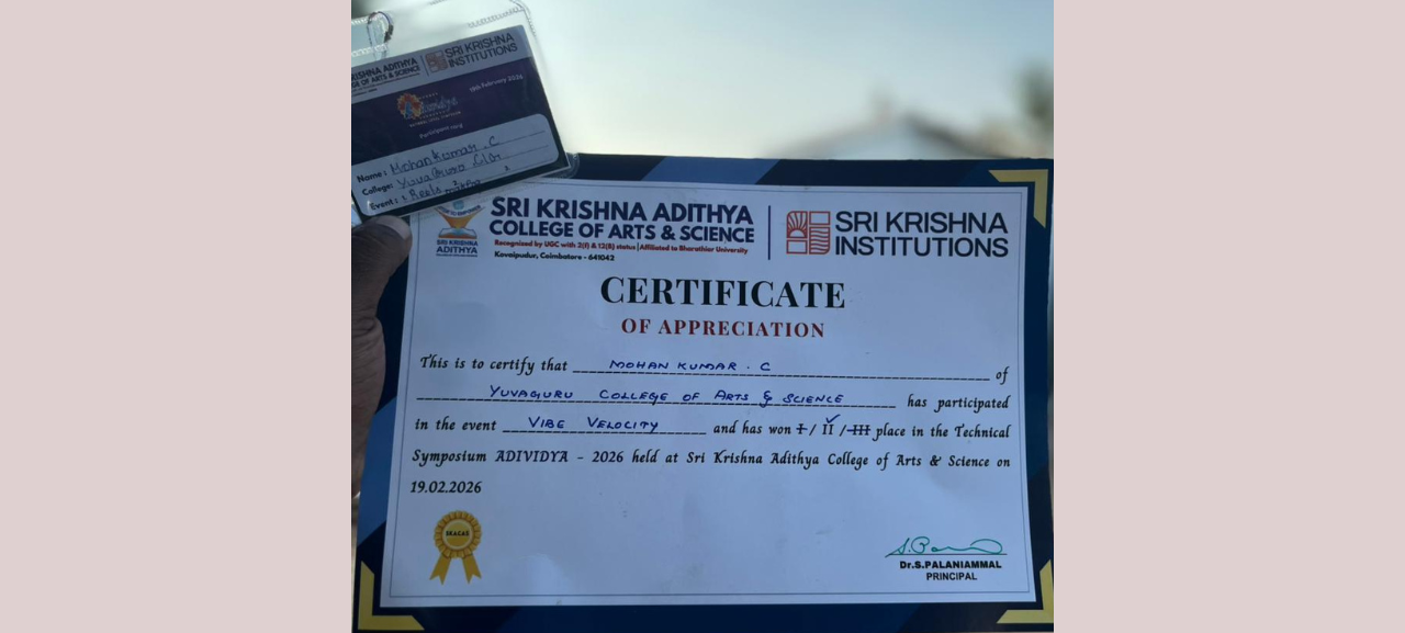 Our college student Mohan Kumar got second prize in the event Vibe Velocity held on 19.02.2026 organized by Sri Krishna Aditya College of Arts and Science